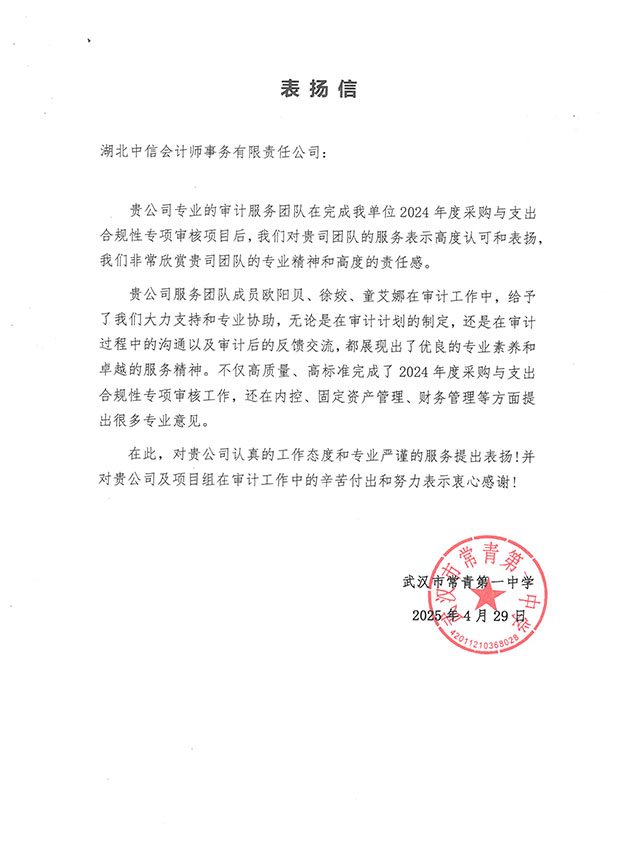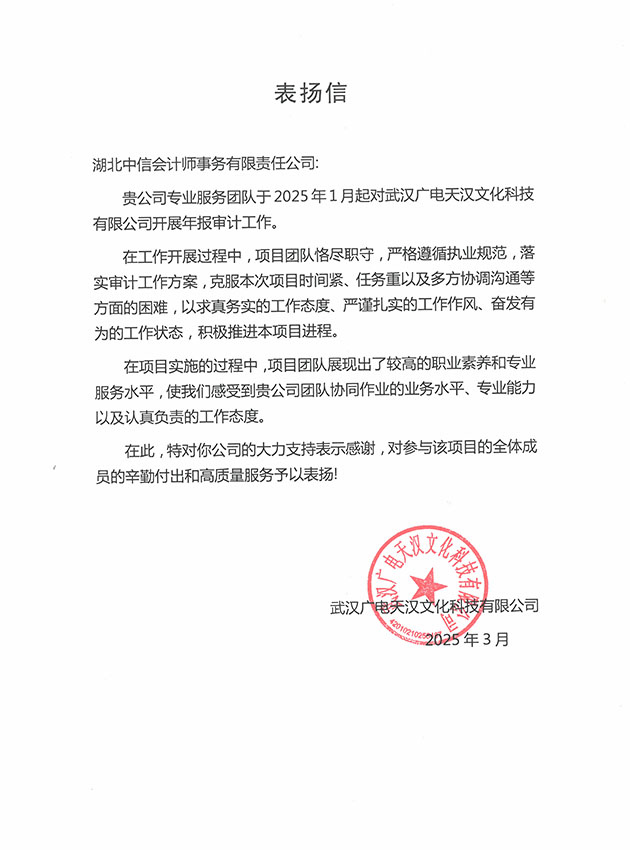 武漢哈工潮江產(chǎn)業(yè)發(fā)展有限公司表揚信