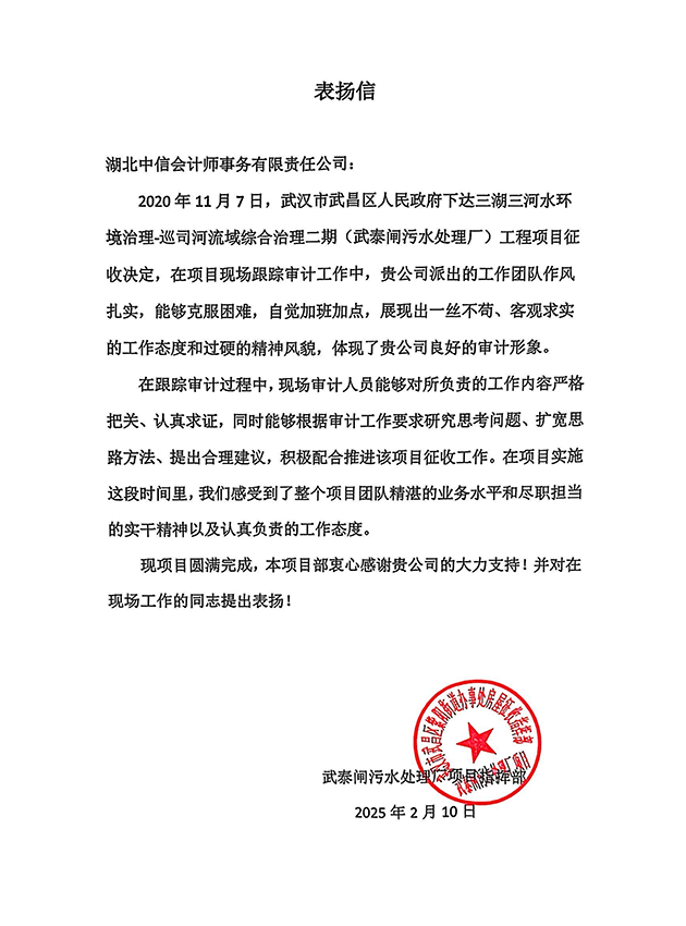 武泰閘污水處理廠項(xiàng)目指揮部表揚(yáng)信