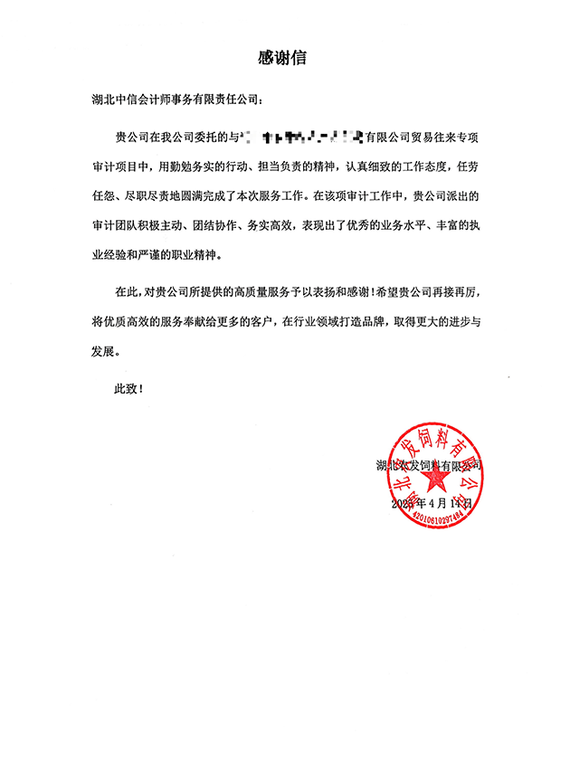 湖北農(nóng)發(fā)飼料有限公司感謝信