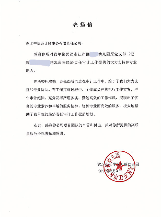 武漢市江岸區(qū)萬錦幼兒園表揚(yáng)信