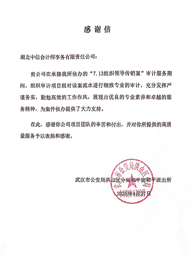 武漢市公安局洪山區(qū)分局和平街和平派出所感謝信