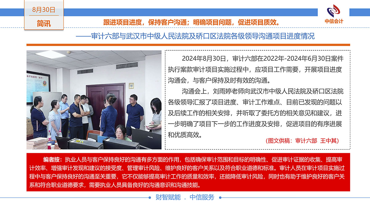 審計六部與武漢市中級人民法院及硚口區(qū)法院各級領(lǐng)導(dǎo)溝通項目進度情況 -