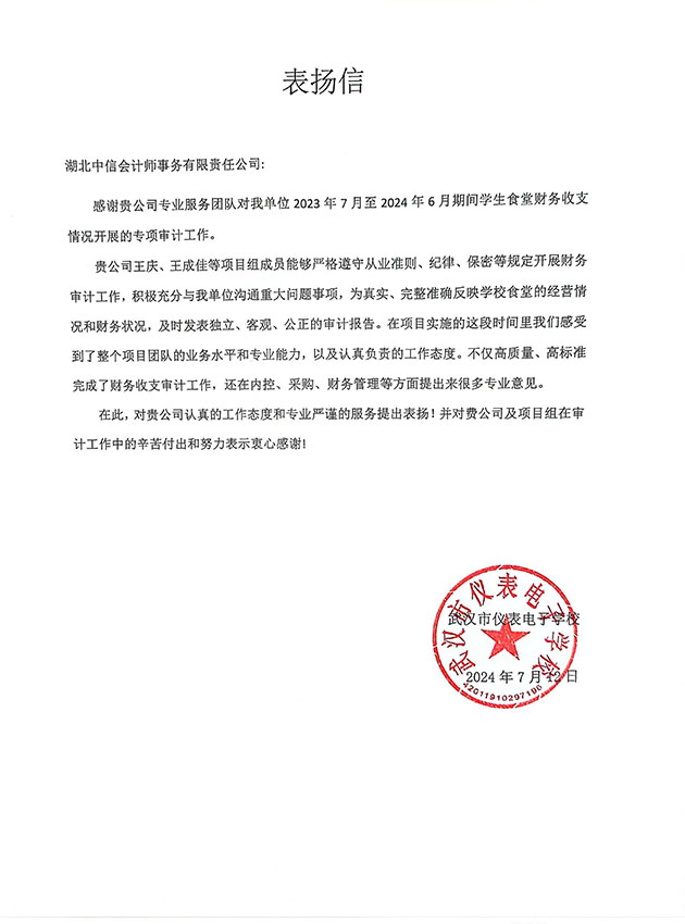 武漢市儀表電子學(xué)校收支專項審計表揚信