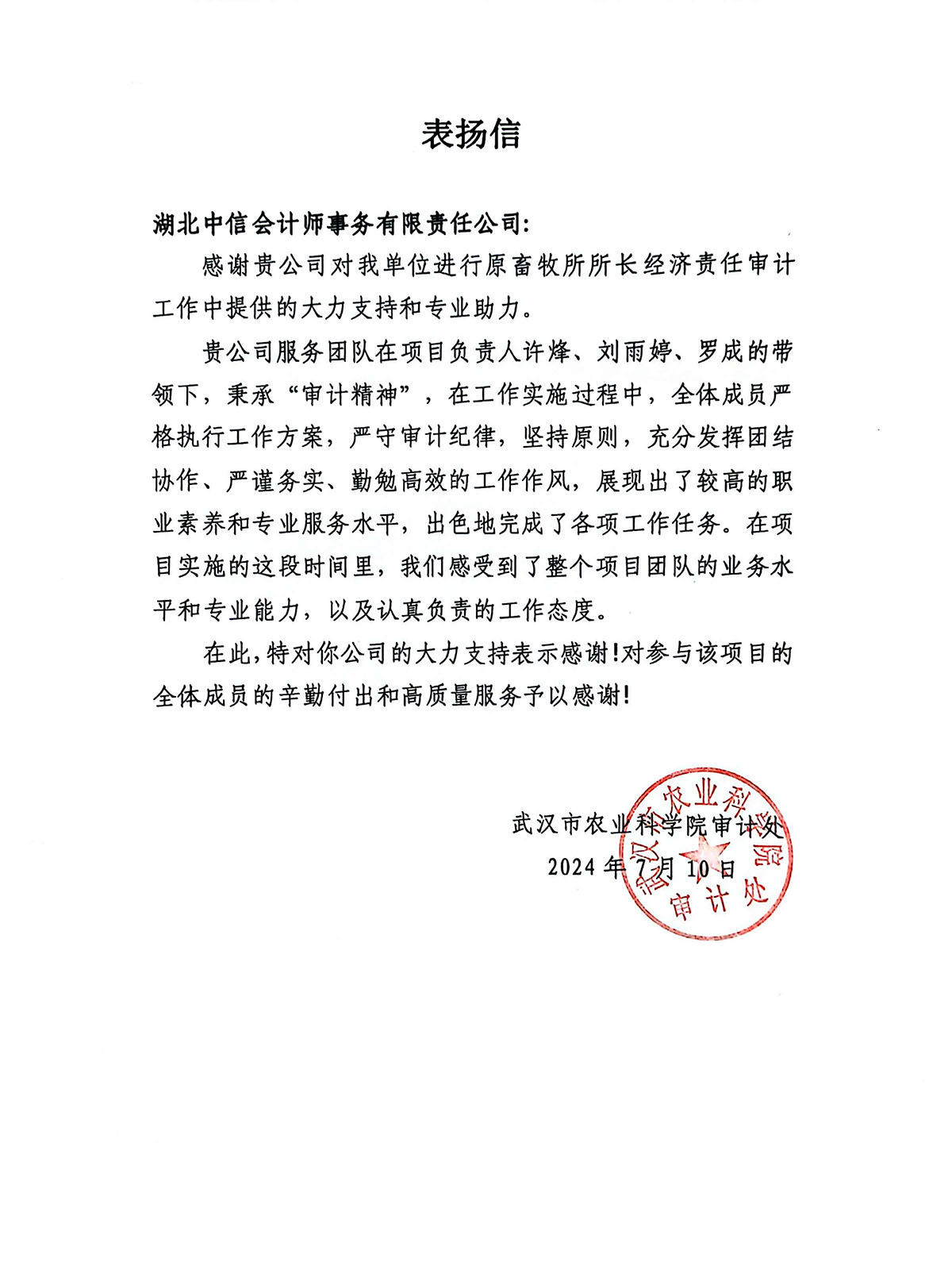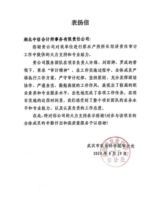 武漢市農(nóng)業(yè)科學(xué)審計處表揚信