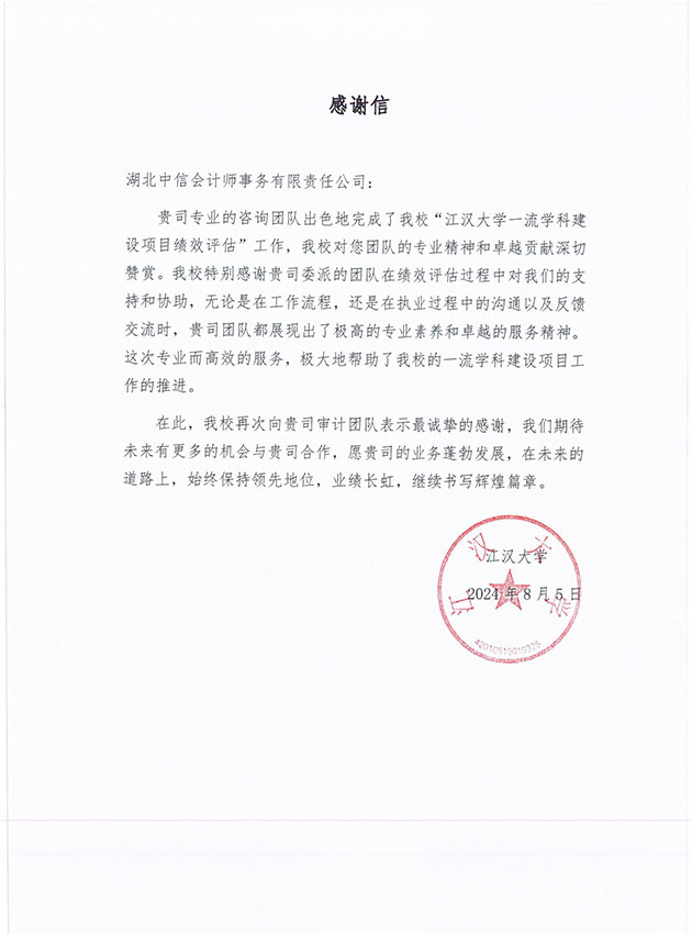 江漢大學(xué)感謝信