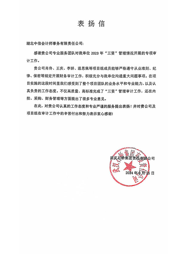 武漢石橋集團責(zé)任有限公司表揚信