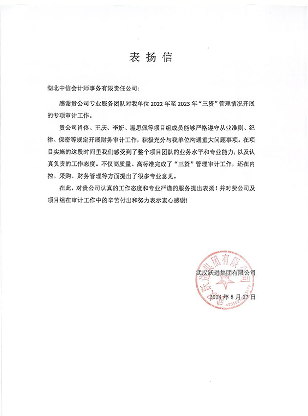 武漢躍進集團有限公司表揚信