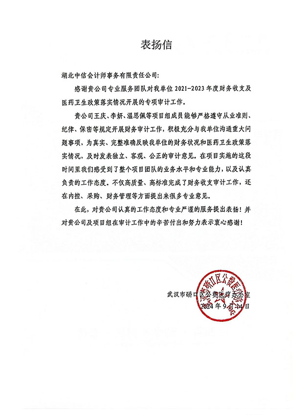 武漢市硚口區(qū)公費醫(yī)療辦公室表揚信