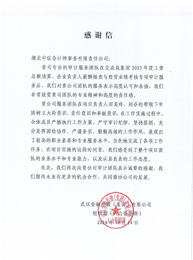 武漢金融控股(集團)有限公司組織部感謝信