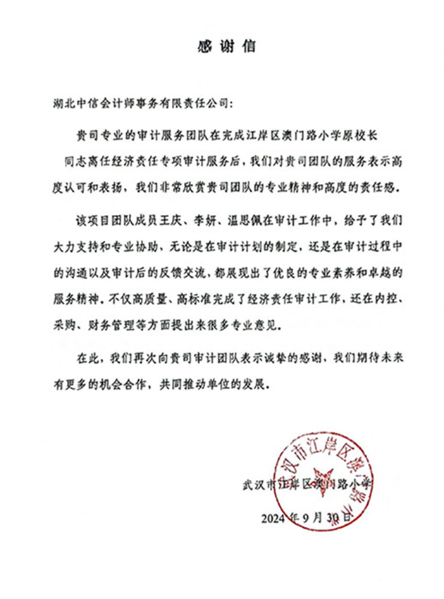 武漢市江岸區(qū)澳門路小學(xué)感謝信