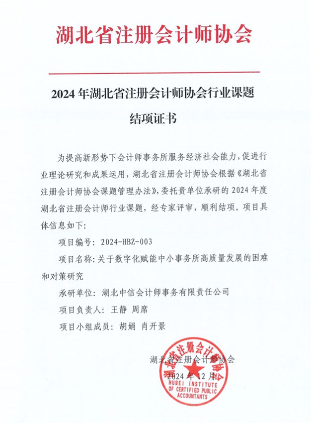 2024年湖北省注冊(cè)會(huì)計(jì)師協(xié)會(huì)行業(yè)課題結(jié)項(xiàng)證書(shū)
